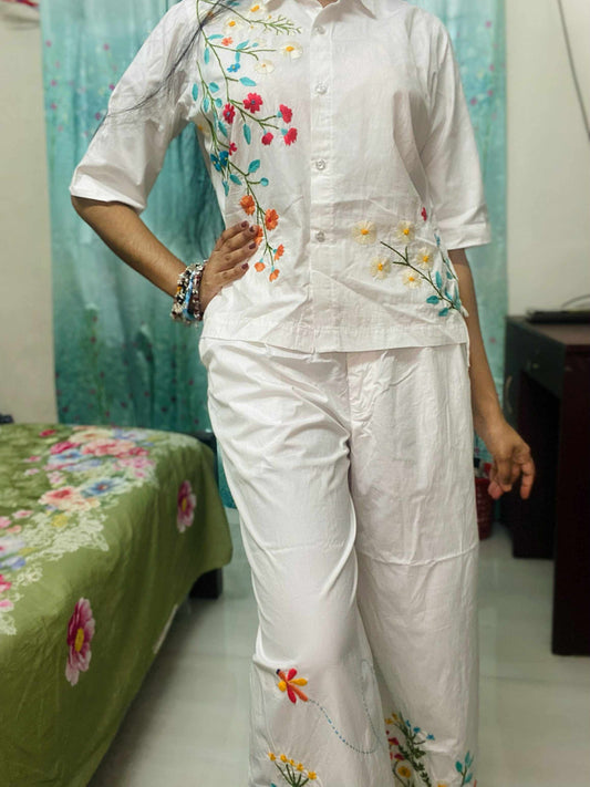 Alpona - Pure Cotton Hand Embroider Wide - Leg Pants