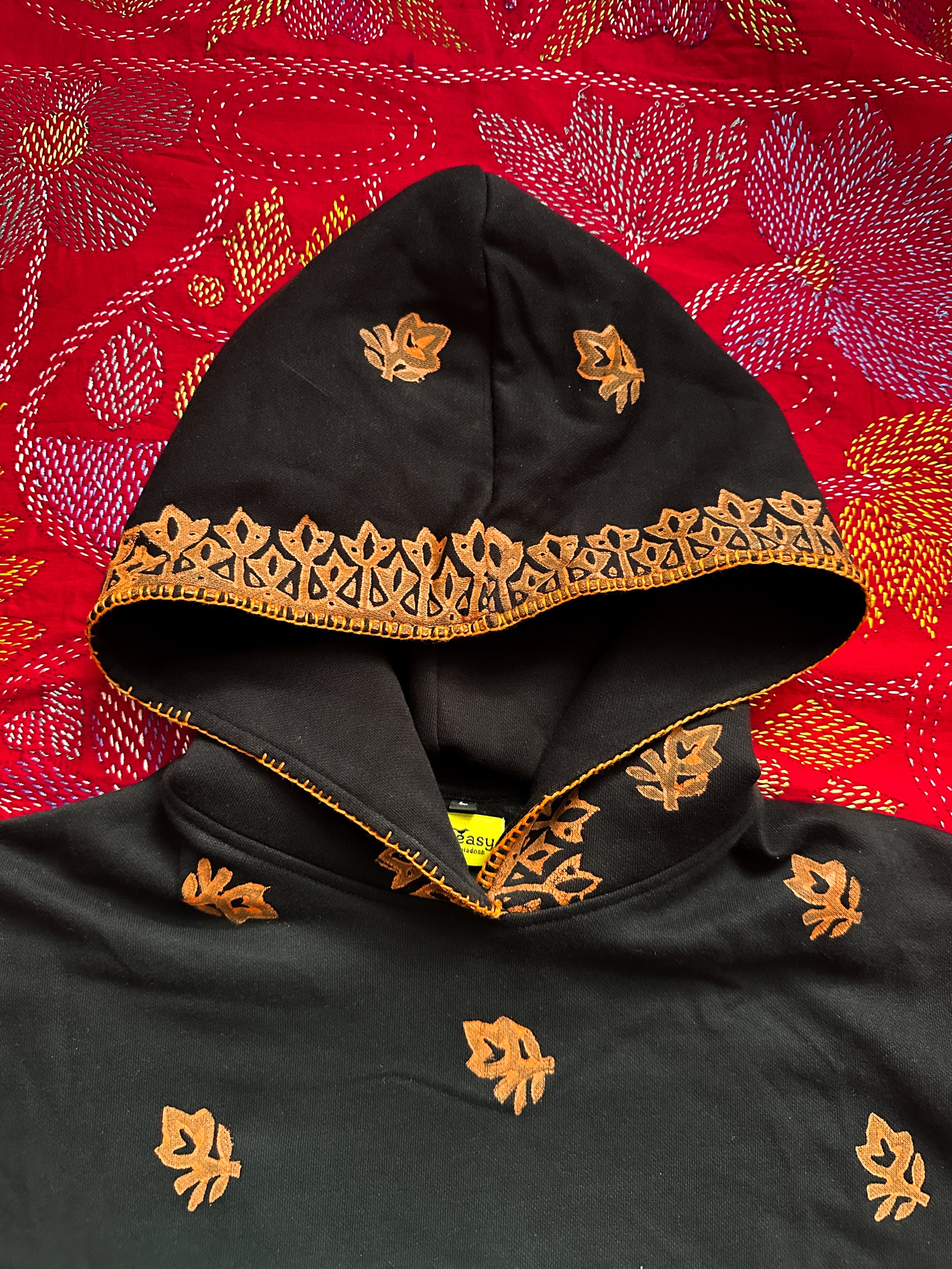Each hoodie takes over 20 hours to create, crafted entirely by hand using traditional Bangladeshi embroidery and hand block printing techniques. No two pieces are identical — every stitch tells a story of patience, skill, and cultural heritage.